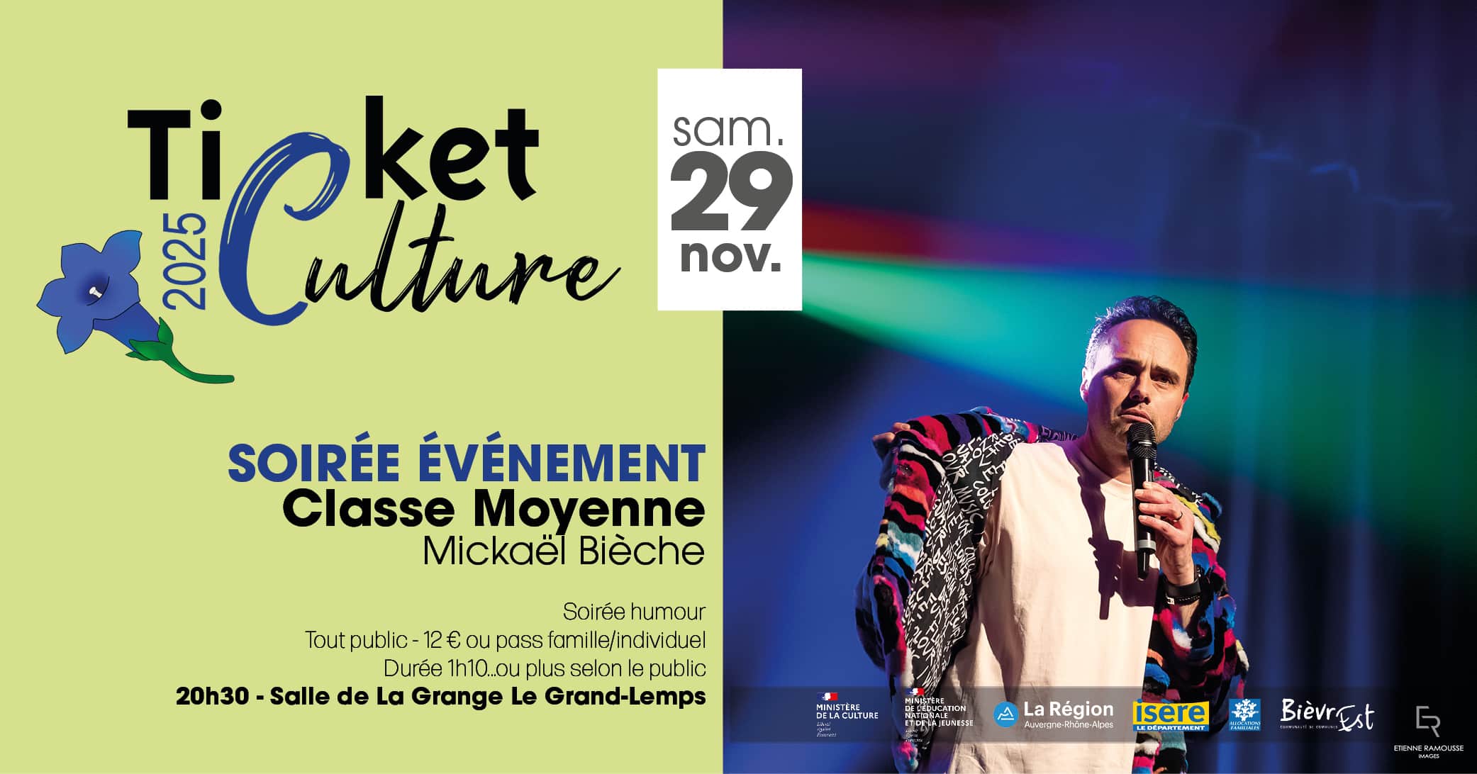 deviennent des sujets épiques. Avec Mickaël Bièche, on rit ensemble de la moyennitude avec panache, entre stand-up ciselé et personnages plus vrais que nature. Primé en 2023 au Festival National des Humoristes de Tournon sur Rhône, Classe moyenne dresse un portrait hilarant d’une France qui rêve de grandeurs mais avec ses moyens.