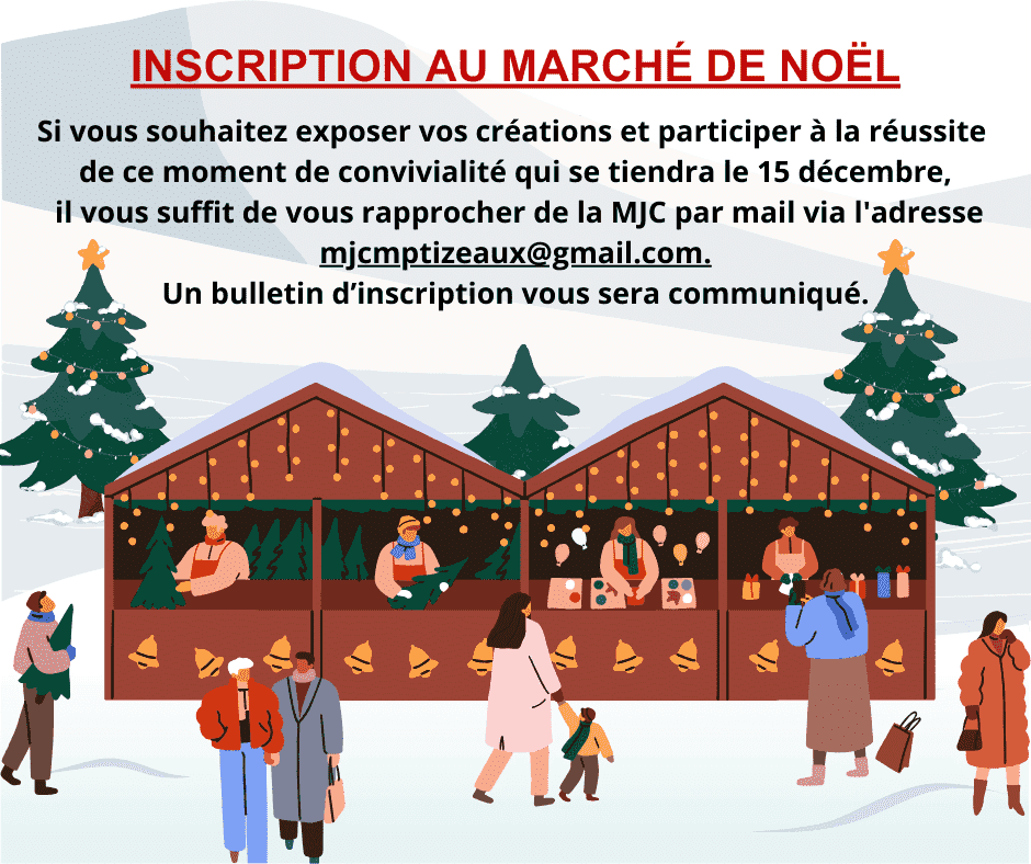 La MJC d’Izeaux ainsi que le club US rugby d’Izeaux sont heureux de vous annoncer le grand retour du “Marché de Noël” 👉 le dimanche 15 décembre 2024 à la Salle Polyvalente d’Izeaux (Gymnase). Animations et bonne ambiance seront au rendez-vous. Le Père Noël nous fera l’honneur de sa présence. Une tombola et un concours de dessins pour les enfants seront également organisés. Si vous souhaitez exposer vos créations et participer à la réussite de ce moment de convivialité, il vous suffit de vous rapprocher de la MJC par mail via l’adresse : mjcmptizeaux@gmail.com. Un bulletin d’inscription vous sera communiqué. Nous vous remercions de votre attention, et vous souhaitons nombreux pour cet évènement.